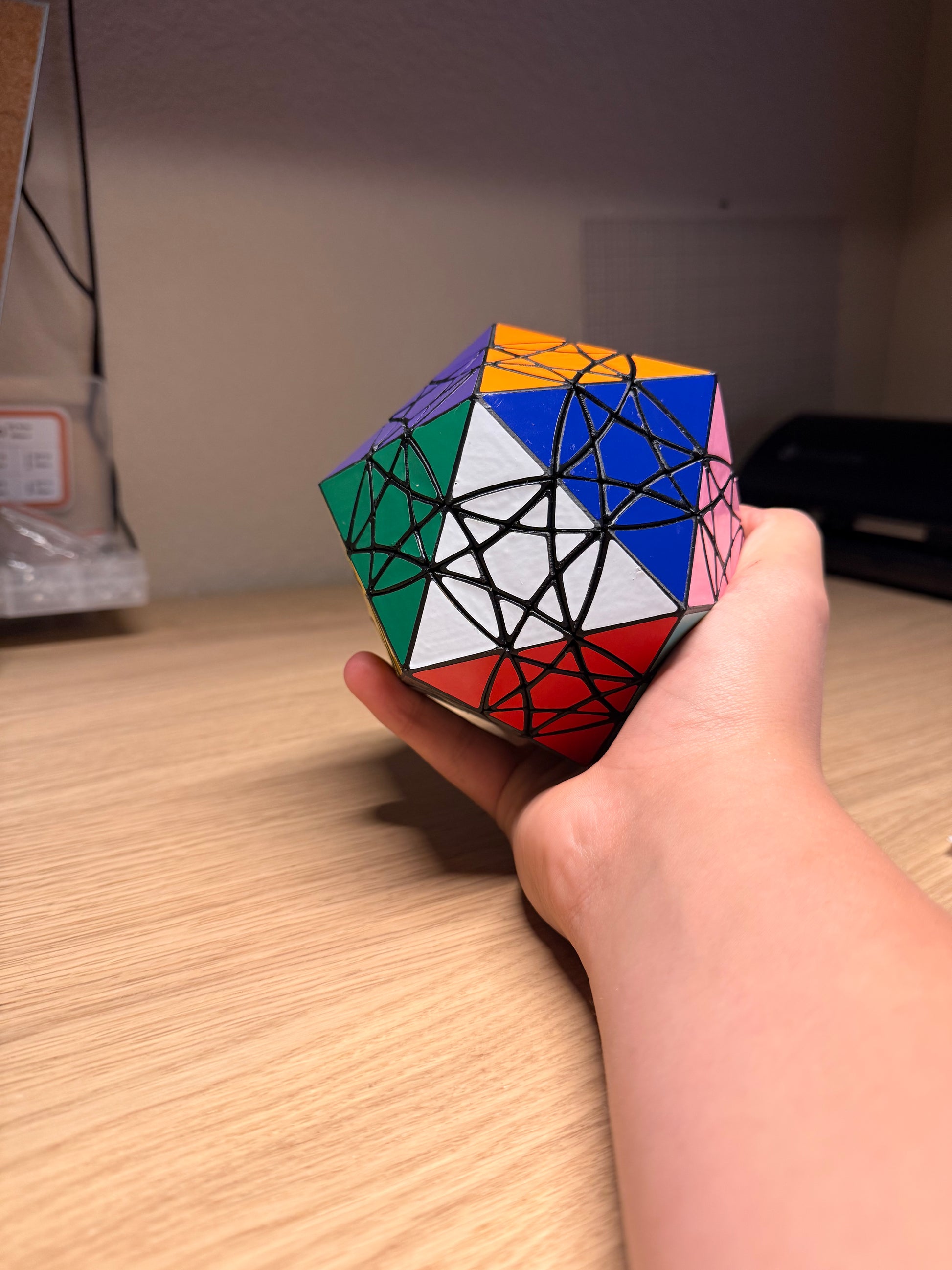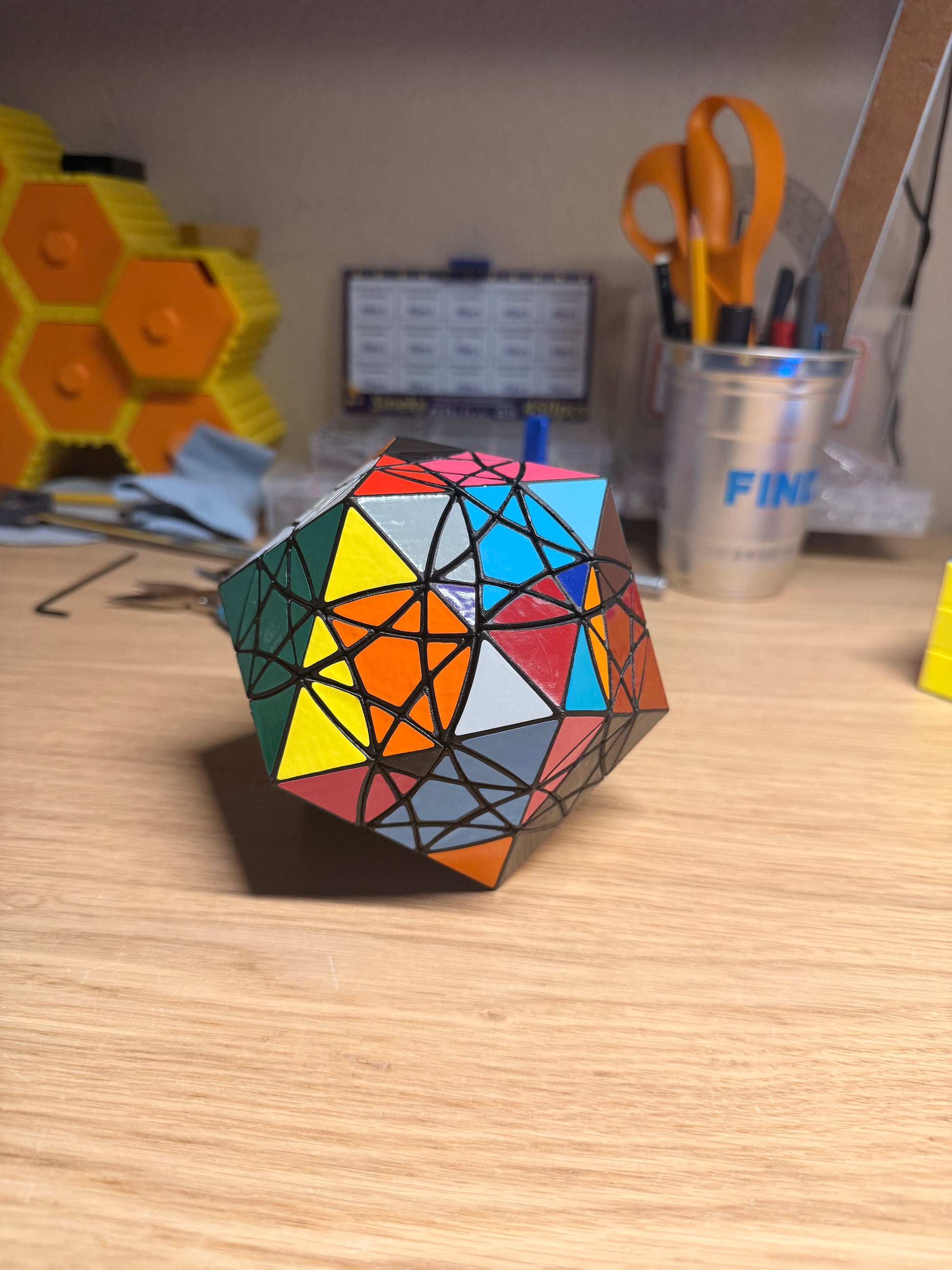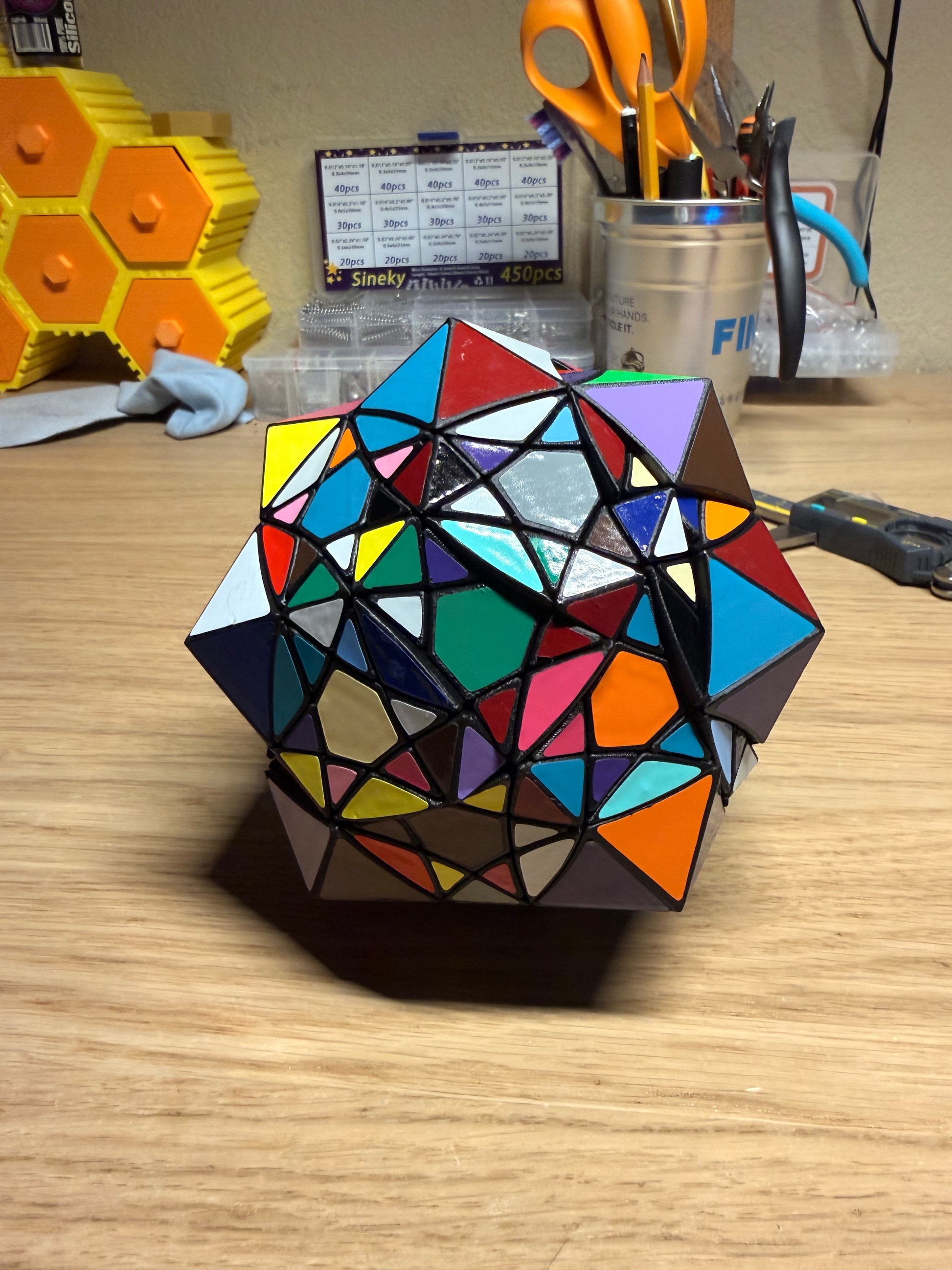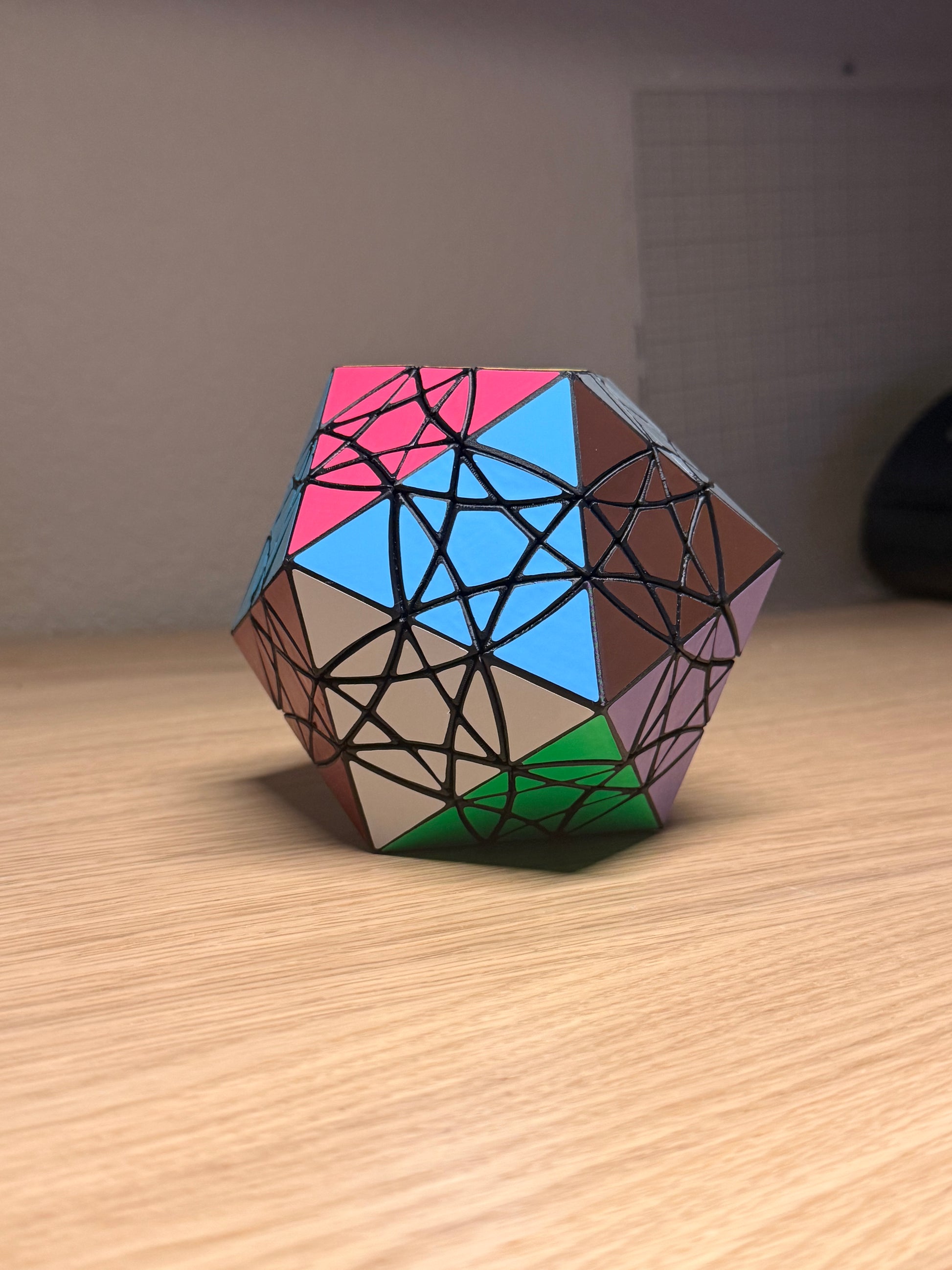 The Radio Jewel is a twenty-sided, face turning Icosahedron with cuts deeper than the regular radiolarian 3 series or the Eitan Star series. It is also known as the Radiolarian 7. This puzzle is a challenging puzzle and has over 350 total pieces, with 242 external pieces. It uses the shells mechanism for its turning and has an edge length of 70mm and a face to face length of 106mm.